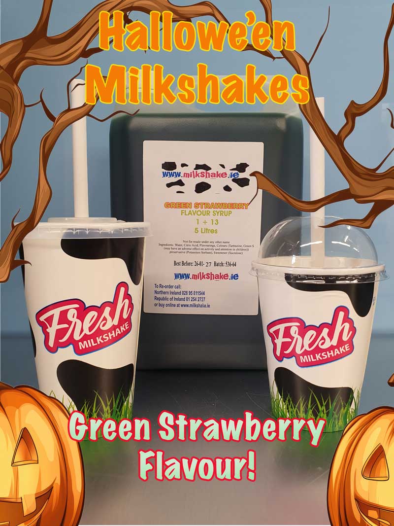 Green Strawberry Milkshake Mix 5 litre.This is one of our new milkshake flavours for Hallowe'en 2025. This scary strawberry flavour...
