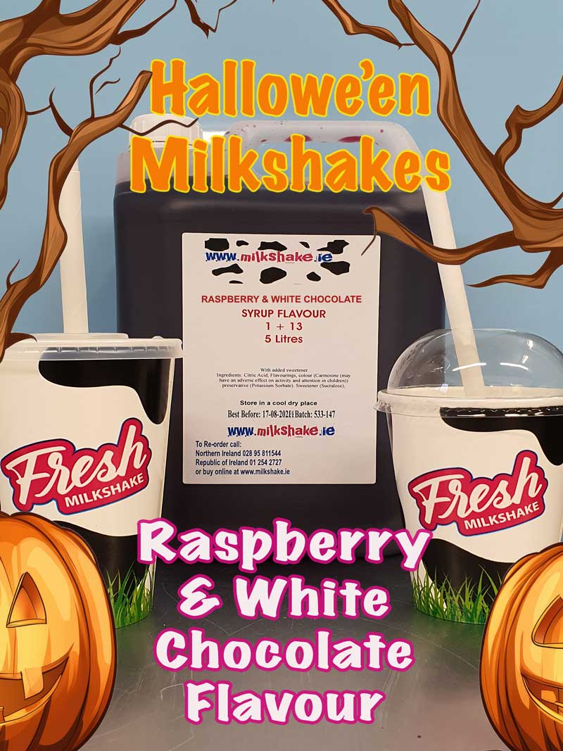 Another new milkshake flavour for Hallowe'en 2025. Our luscious raspberry and white chocolate flavour is perfect for any party! It is great in a milkshake, or to add delicious flavour to rich creamy fresh milk. Its really concentrated so a 5 litre bottle will give you enough raspberry and white chocolate milkshake syrup to make 250 x 12.oz/330ml Milkshakes.